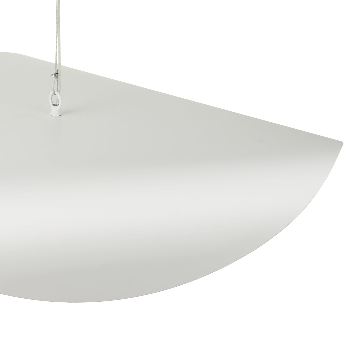 • Suspensie pe cablu subțire alb, atașat la o rozetă rotundă albă de tavan.