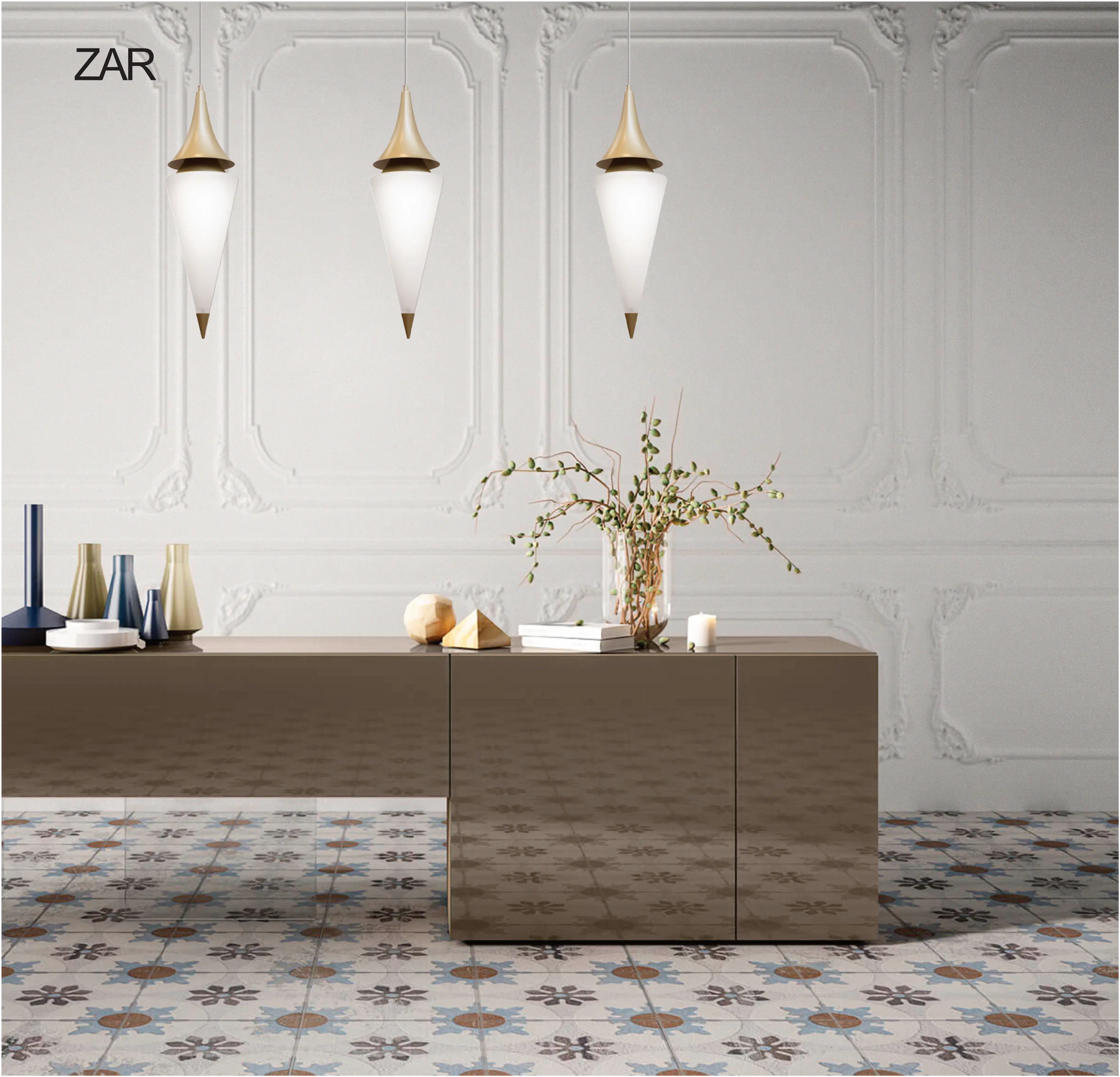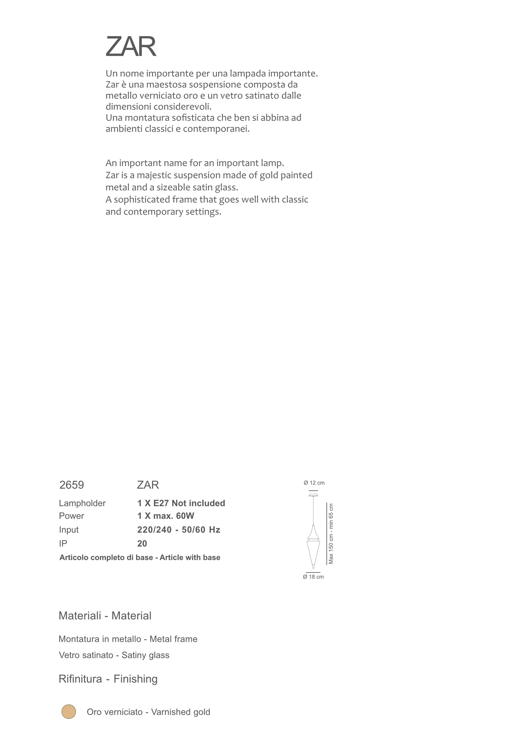 Un nume important pentru o lampă importantă. Zar este o suspendare măreață realizată din metal vopsit în aur și un sticlă satinată de dimensiuni considerabile. O ramă sofisticată care se potrivește bine atât cu decorurile clasice, cât și cu cele contemporane.