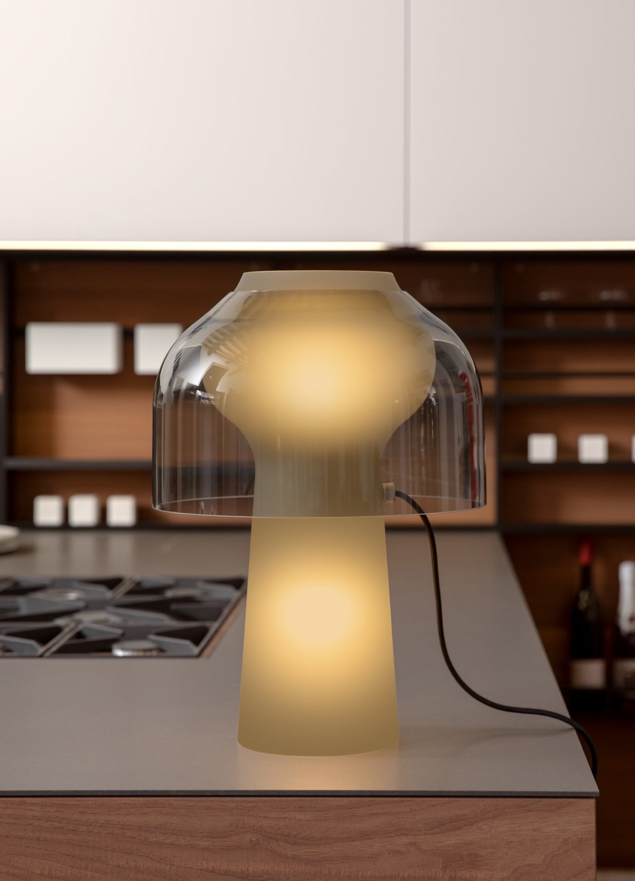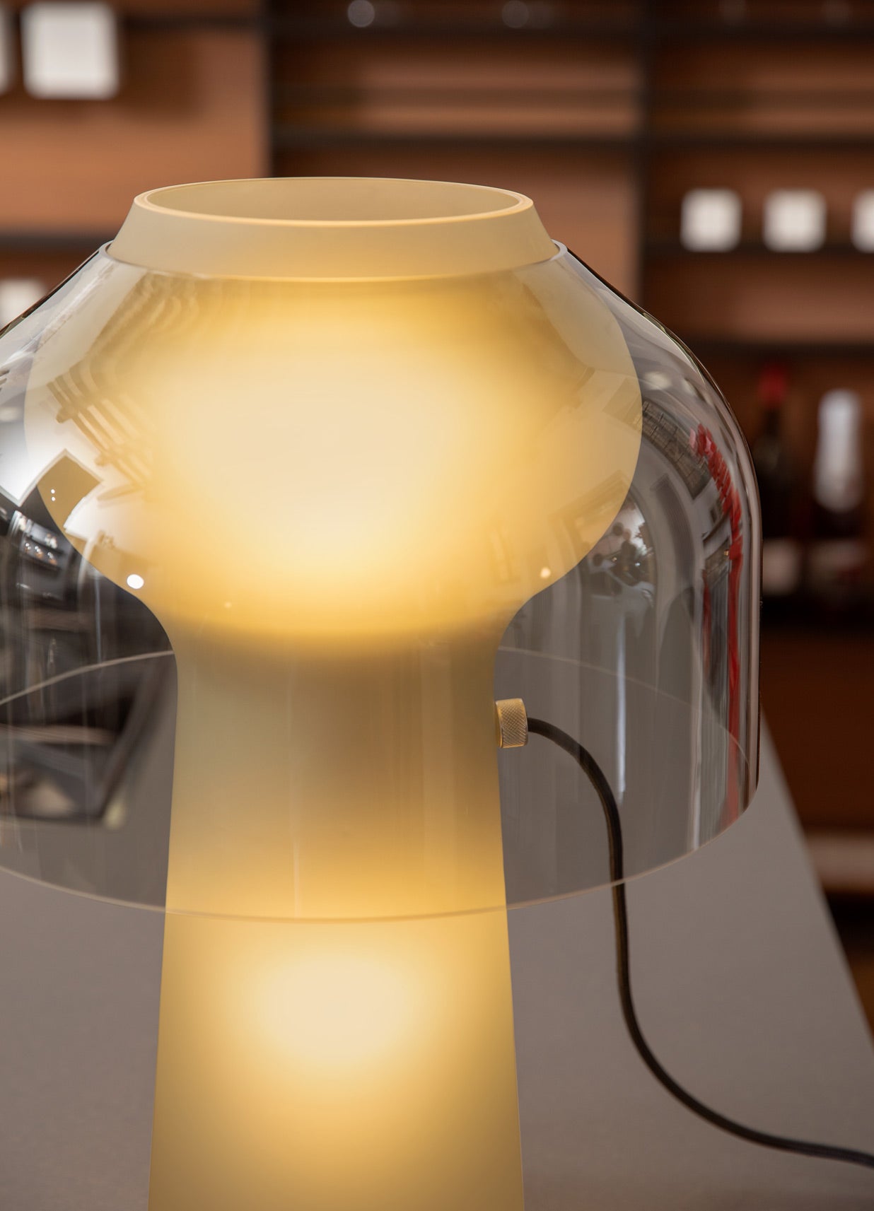 - o variantă fumurie, cu corpul în sticlă mată fumurie și difuzorul în sticlă transparentă, pentru un contrast elegant.